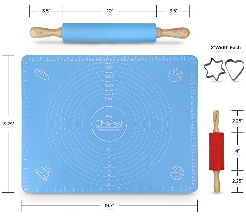 SPECIAL EXTRAS INCLUDED: This combo set also comes with a 100% food-grade silicone pastry mat and two handy cookie cutters. The flexible, BPA-free kneading mat with measurements is high-heat resistant, lays flat on any surface, prevents dough from sticking, and keeps your counters clean. The star- and heart-shaped cookie cutters keep kids safe and create perfect cuts every time.