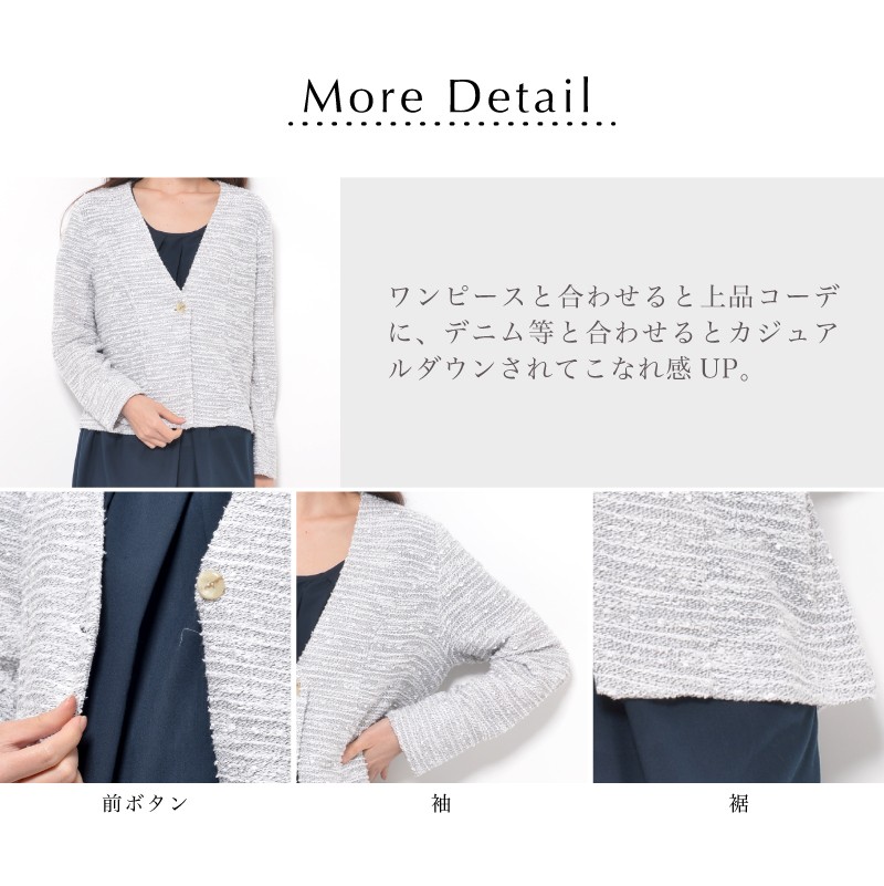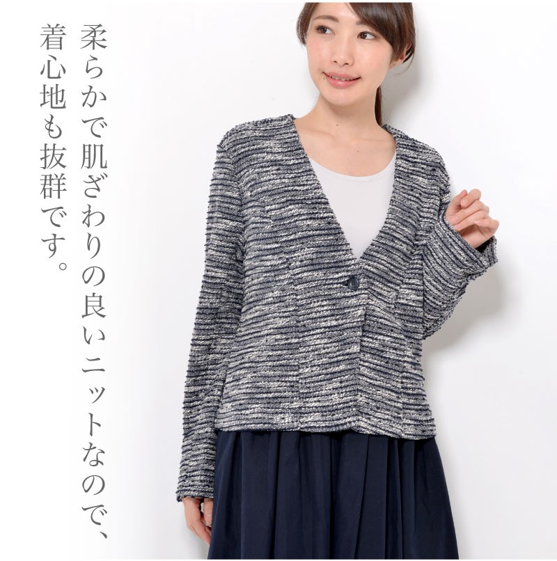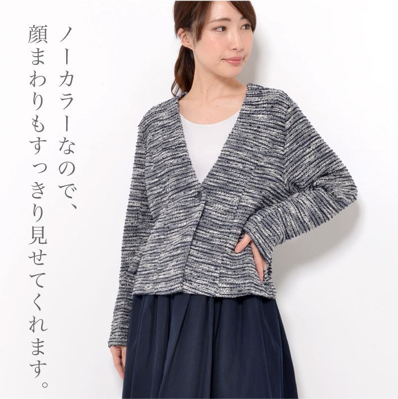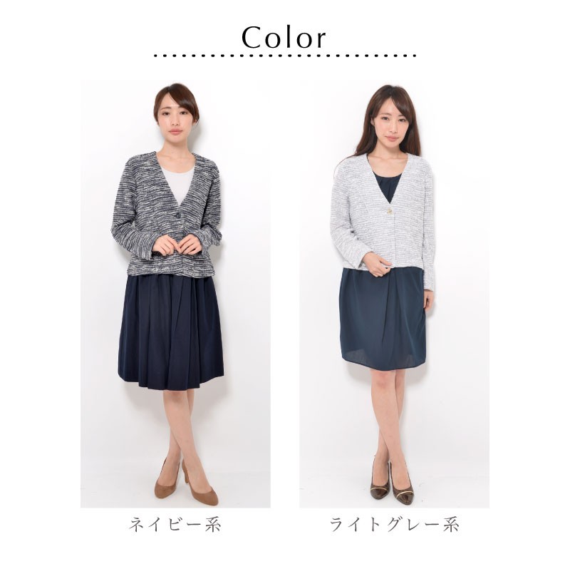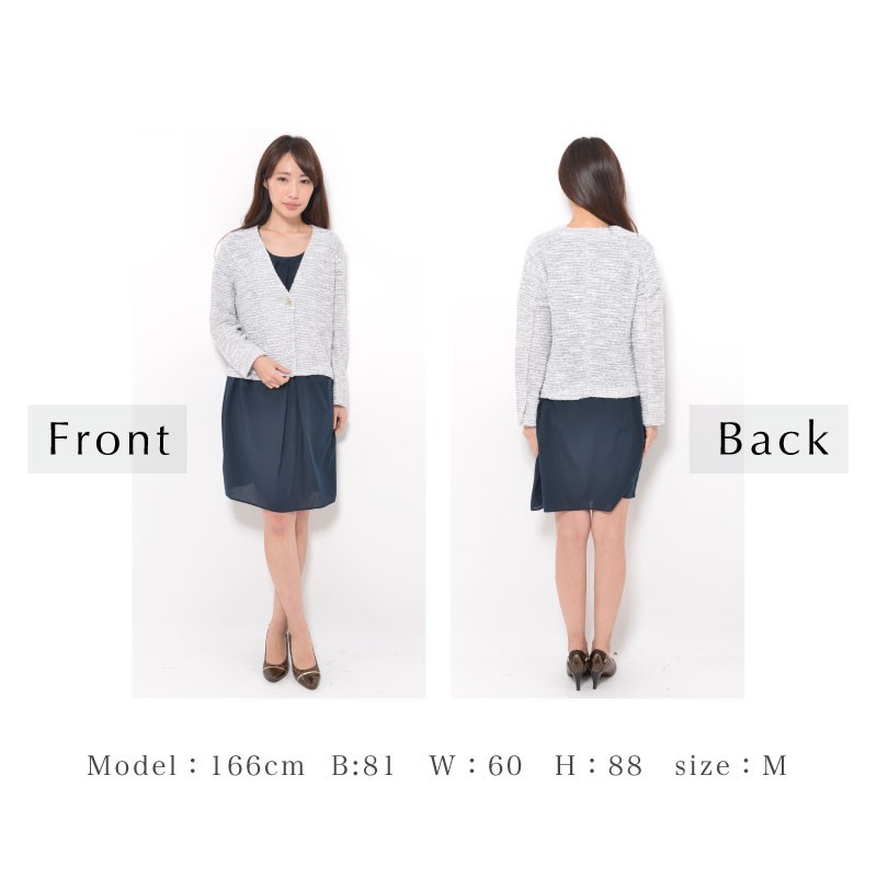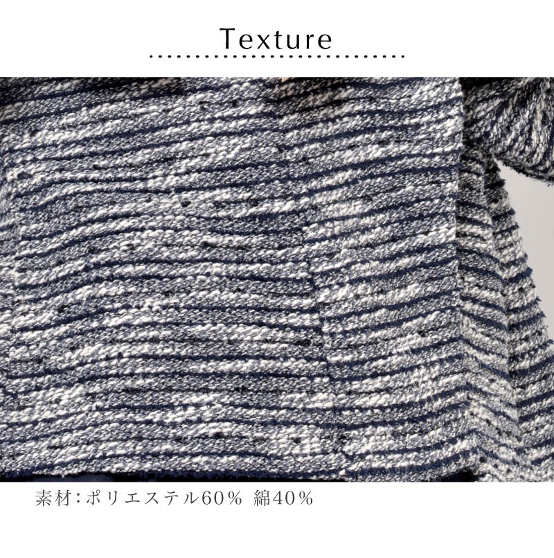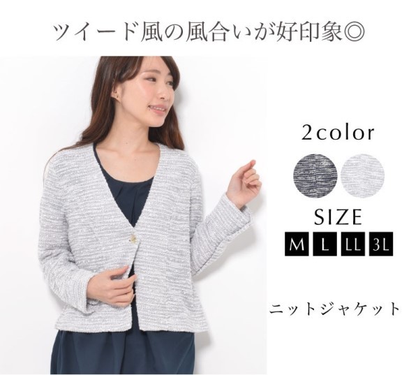 | サイズ | Mサイズ Lサイズ LLサイズ 3Lサイズ | | 実寸 | 表記は全てcm [M] バスト92(79-87) 身丈53 袖丈56 肩幅37 [L] バスト98(86-94) 身丈53 袖丈56 肩幅39 [LL] バスト104(93-101) 身丈55 袖丈56 肩幅41 [3L] バスト110(100-108) 身丈55 袖丈56 肩幅43 | | 素材 | ポリエステル60% 綿40% | | 生産国 | 中国 | | 裏地 | なし | | 生地の伸縮 | あり | | 生地の透け感 | なし | | カラー | 01. ネイビー系 02. ライトグレー系 | | 注意点 | ▼綿混合商品は洗濯時に多少縮む事がございます。 ▼パソコン、モニター等の環境により、実際の商品素材カラーが多少異なる場合が御座います。予めご了承ください。 ▼お手数ですが必ずお買い物ガイドを一読頂いてからご利用いただきますようお願い申し上げます。 | |