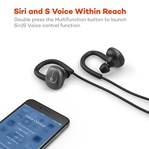 Feature : SMART VOICE COMMAND: Access Siri or S Voice from your headphone, send a message, make a reservation, call a friend, or even ask Siri what song you are whistling, and more, double press to activate on iPhone and Samsung Galaxy phones / ADVANCED SWEAT PROTECTION: Water never stands a chance, thanks to IPX5 water resistant protection against body sweat and wet weather conditions / FLAWLESS SOUND: Enjoy high-quality Bluetooth wireless music and pure natural sound with aptX technology, experience high clarity like never before / SUPERIOR DESIGN: Ergonomically designed to comfortably fit the contours of your ear, soft ear hooks and interchangeable ear tips keep the earphones in place while walking, running, and exercising / SPEAK WITH CONFIDENCE: Ceramic antenna improves signal strength and eliminates intermittent connections; inline microphone and controls let you take full control of your music list; answer phone calls without reaching your phone