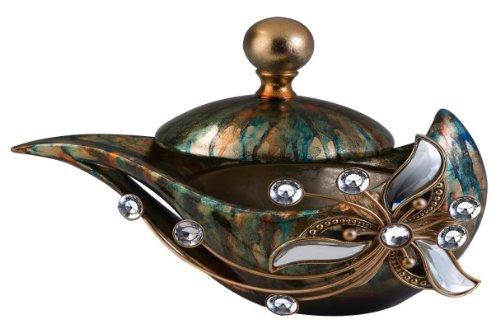 -. Feature : The Florria decorative box with crystal and mirror glass flower accent is a uniquely designed decorative piece with streaks of green and bronze finish / May use this decorative box as a home decoration or to place valuable goods inside the box / Place this in living room or in owns bedroom for style / Use a dry cloth to clean / Made of Polyresin