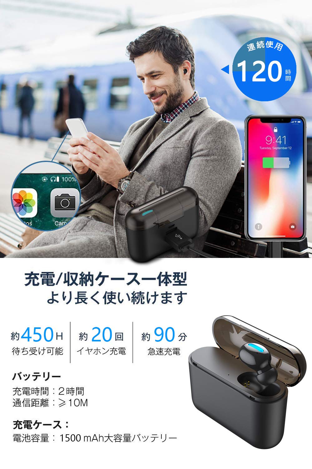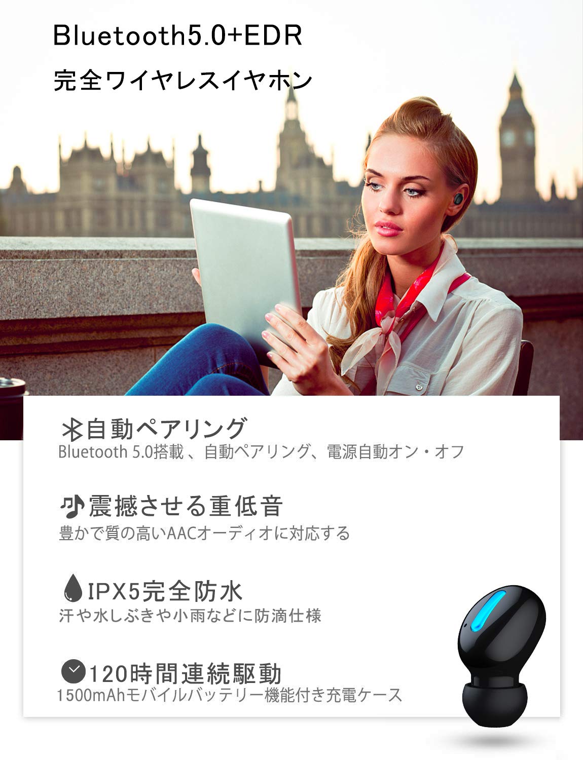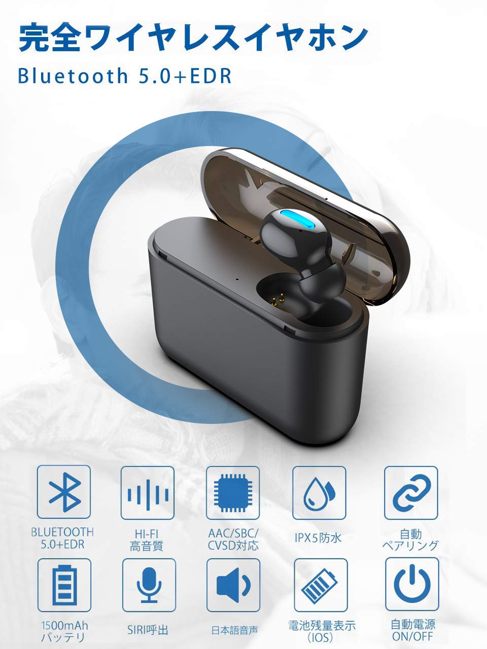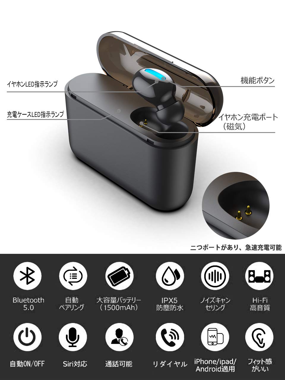 【大容量Bluetooth 5.0 】Bluetooth ヘッドセット 80時間連続駆動 自動ON/OFF 自動ペアリング Bluetooth ヘッドフォン ワイヤレス イヤホン 小型 超軽量 1500mAh 大容量充電ケース付き IPX5防水 Bluetooth イヤホン 片耳 マグネット充電式 Bluetooth イヤホン 高音質 抜群の装着感 マイク内蔵 CVC6.0ノイズキャンセリング IPhone&Androidなど対応可(Q32)