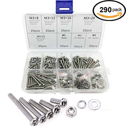 290pcs M3 Phillips Pan Head Screws Bolts Nuts Lock Flat Washers Assortment Kit (M3,304 Stainless Steel)