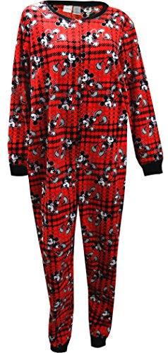 These Disney brand union suit pajamas for women are printed with Mickey Mouse. This one-piece pajama is red and black plaid and are printed with Mickey Mouse smiling and strutting along. The polyester knit fabric is machine washable and ultra-cozy. The sleeves and legs are cuffed with black jersey knit fabric. These pajamas zip straight up the front for easy access.Feature