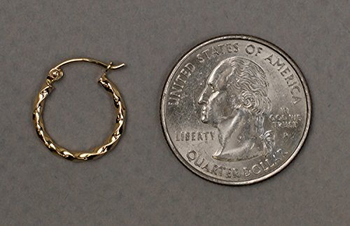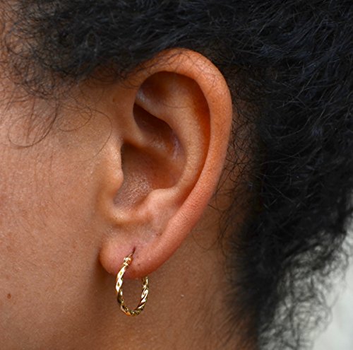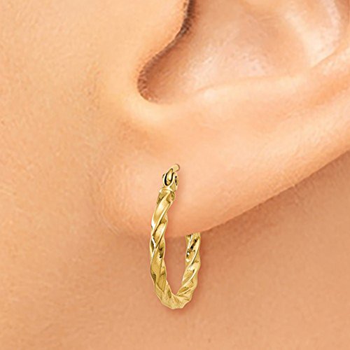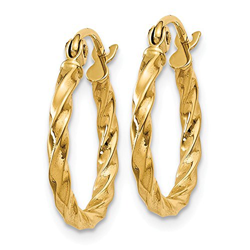 Add a bit of fun to your everyday professional look with these twisted hoop earrings. These 14k yellow gold hoops are the perfect mix of elegance and charm. Add them to any outfit for an interesting, one of a kind look that is sure to impress. And with a 2mm wide body, and an easy click down clasp, these hoops are sturdy and easy to wear. Let their beautifully spiraled design compliment your unique look and style. Each pair of hoop earrings comes gift wrapped in an attractive package. These hoops are 14k yellow gold. They are NOT plated, but have a pure gold body with a hollow interior. Every hoop comes with an authenticated 14k stamp.Feature