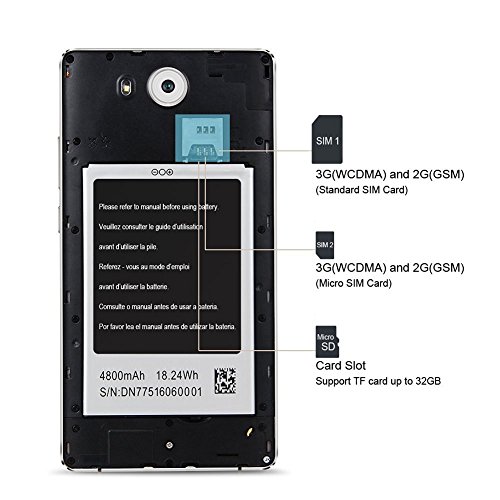 -. Feature : Fast 1.3 GHz quad-core MediaTek 6580 ARM Cortex processor with 8 GB Internal memory and 1 GB RAM / Enjoy Google Android 5.1 Lollipop, including Google Play Store, Google, Google Maps, Gmail, WhatsApp, You Tube and more / Dual SIM and MicroSD support for up to 32 GB of expandable storage / Stunning 6" HD display plus an 5 MP main camera and 2 MP selfie camera, both cameras are with LED flash and auto focus / 3G(WCDMA 850/2100MHz) plus GSM(850/900/1800/1900MHz) unlocked for your favorite compatible carrier or for international travel; For example, works on all Nationwide GSM Networks including AT&T, T-Mobile, Cricket, MetroPCS, Straight Talk USA, Pure Talk USA, O2 (UK), Giffgaff and others; works with 3G for AT&T, Cricket Wireless, H20 and TracFone; Not works with 4G