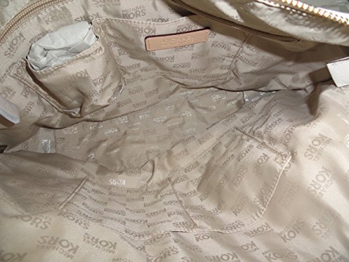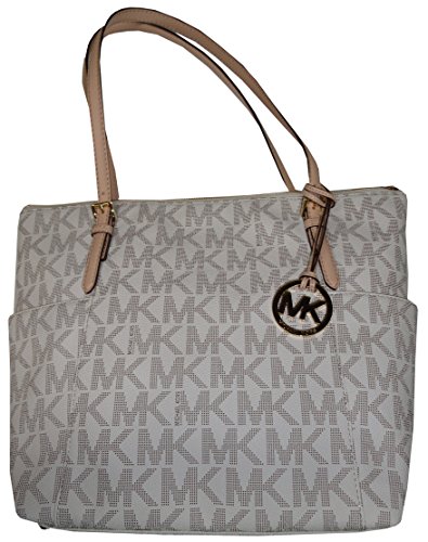 Wrapped MK block Signature PVC with tan leather trim and golden hardware. The interior is lined in Kors logo fabric and features a zippered pocket and four open slip pockets. It has a fully zippered top closure. There are side gusset pockets for additional storage, and a removable Kors circular logo hang charm. Four metal 'feet' help protect the bottom of your bag. Dual tan leather straps have a drop of 8". Overall measurements of approximately 11" (L) at the bottom tapering to 15" (L) at the top x 11.5" (H) x 4" (W).Feature