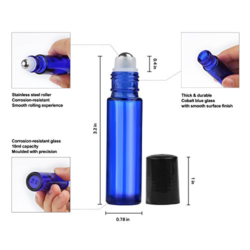 - Quality made: our essential oil roller bottles are made of corrosion-resistant pure cobalt blue glass, they protect your precious essential oils from harmful UVs or quick volatilization. Stainless steel roller ensures smooth oil application experience every time.