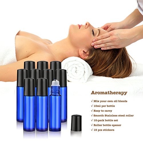 Essential Oil Roller Bottles 10ml (Cobalt Blue, Pack of 10) - Stainless Steel Roller, Individual Package per Bottle, Opener n Labels Included - Glass Roller...