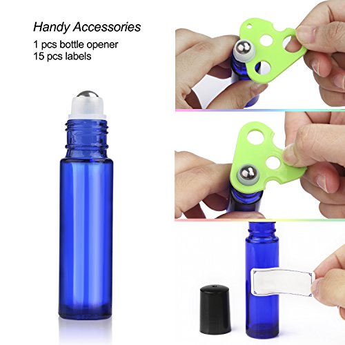 - Handy accessories: each of our glass roller bottle set comes with 15 pieces carefully designed adhesive labels to help you differentiate the oils you put in each bottle, and 1 piece bottle opener to help lift/remove the orifice reducer insert or press it back on bottles with standard capacity of 1ml, 3ml, 5ml, 10ml or 15ml.