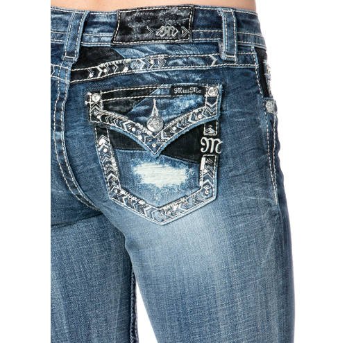 Mid rise straight leg denim jean with rhinestone stud accents and distressed pocket feature