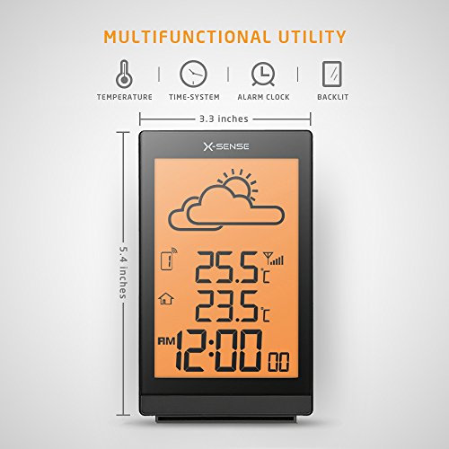 -. Feature : HIGH-PRECISION WEATHER SENSOR: Accurately measures temperature and records daily MAX / MIN; attains a temperature accuracy of ±1°C / WIRELESS OUTDOOR SENSOR: Adopts 433MHZ RF module, featuring a powerful signal penetrability and anti-interference capability; collects organic data right from your exact location and provides forecasting 12-24 hours ahead / EXCELLENT PERFORMANCE: Measurement range of -40 °F up to 158 °F; low temperature warning (28.4 °F-37.4 °F) with Ice Alert icon flashing on LCD; signals transmit as far as 50 m / 165 ft away from outdoor sensor / BACKLIT LCD SCREEN: Clearly displays a wide range of information, including time (12 / 24-hour), alarm time, and indoor and outdoor temperature (°C / °F) with weather trend icon; stands uP.R.Ight on a tabletop / EASY MOUNTING AND BATTERY POWERED: The sensor can be easily positioned outdoors with the wall-mounting hanger; both the main unit and the sensor work on 2 AA batteries (not included)