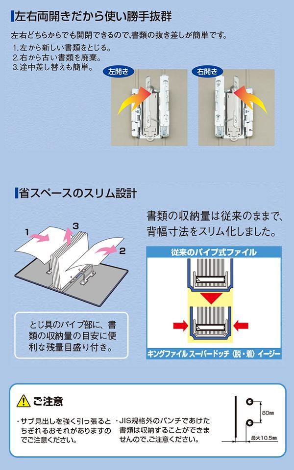 | 仕様 | とじ厚:30mm 収納枚数:300枚 穴数:2穴 穴間隔:80mm 両開式 とじ具着脱可能 差替え全面背見出し |