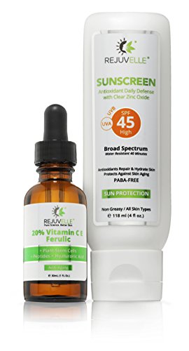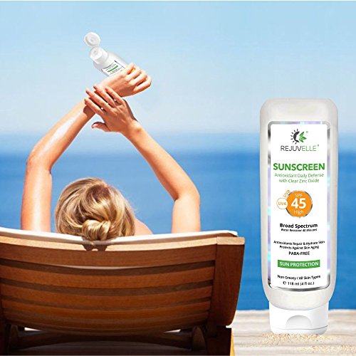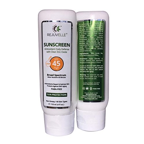 - Title : Rejuvelle Sunscreen For Face ★ SPF 45 PABA FREE Clear Mineral Zinc Oxide 4 fl.oz. Anti Aging UVA Broad Spectrum. Cucumber Aloe Vera Lotion With Vitamin C,D,E ★ Non Comedogenic. Waterproof, Sweatproof. Mineral OIL FREE. 365 DAY GUARANTEE!!