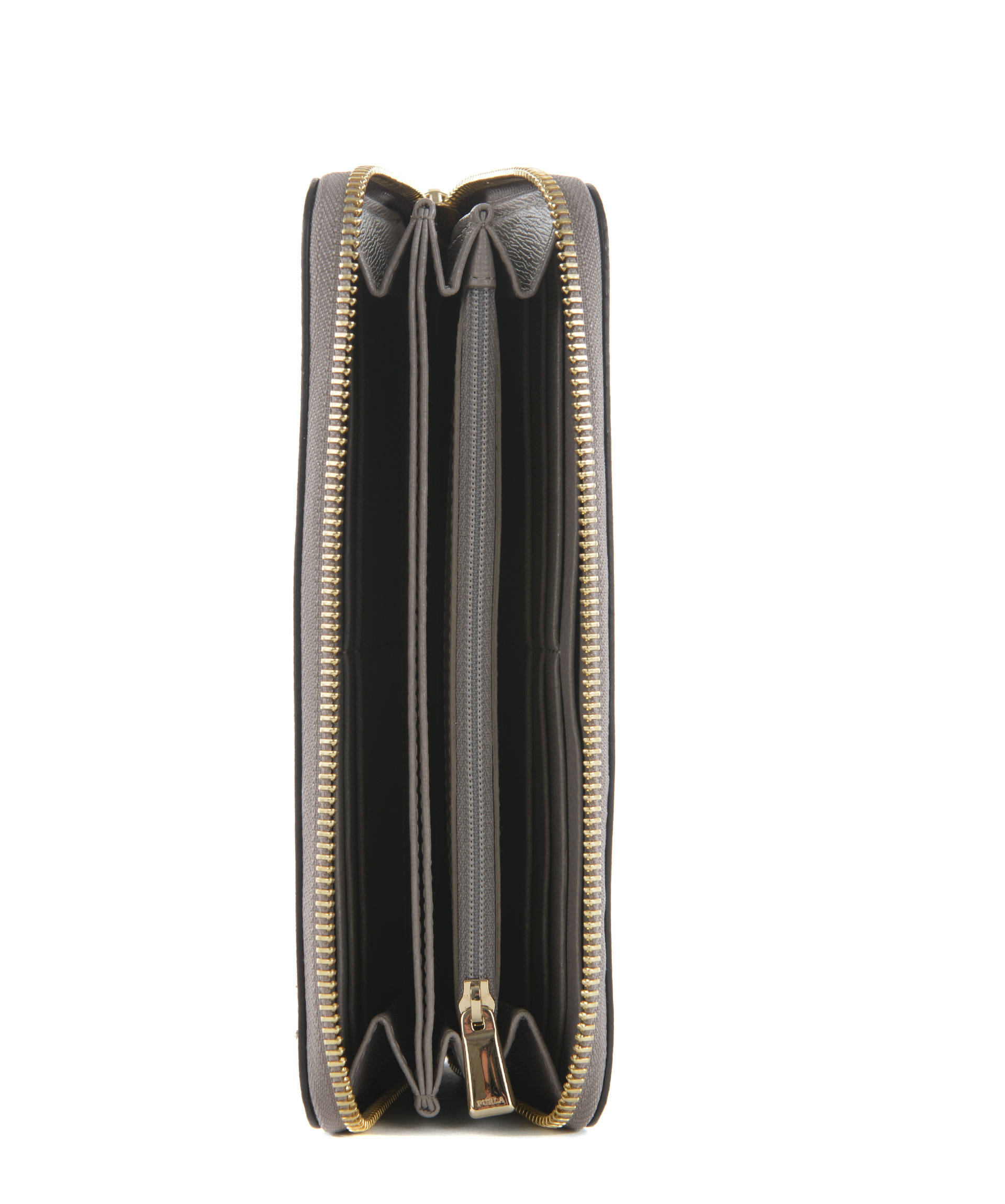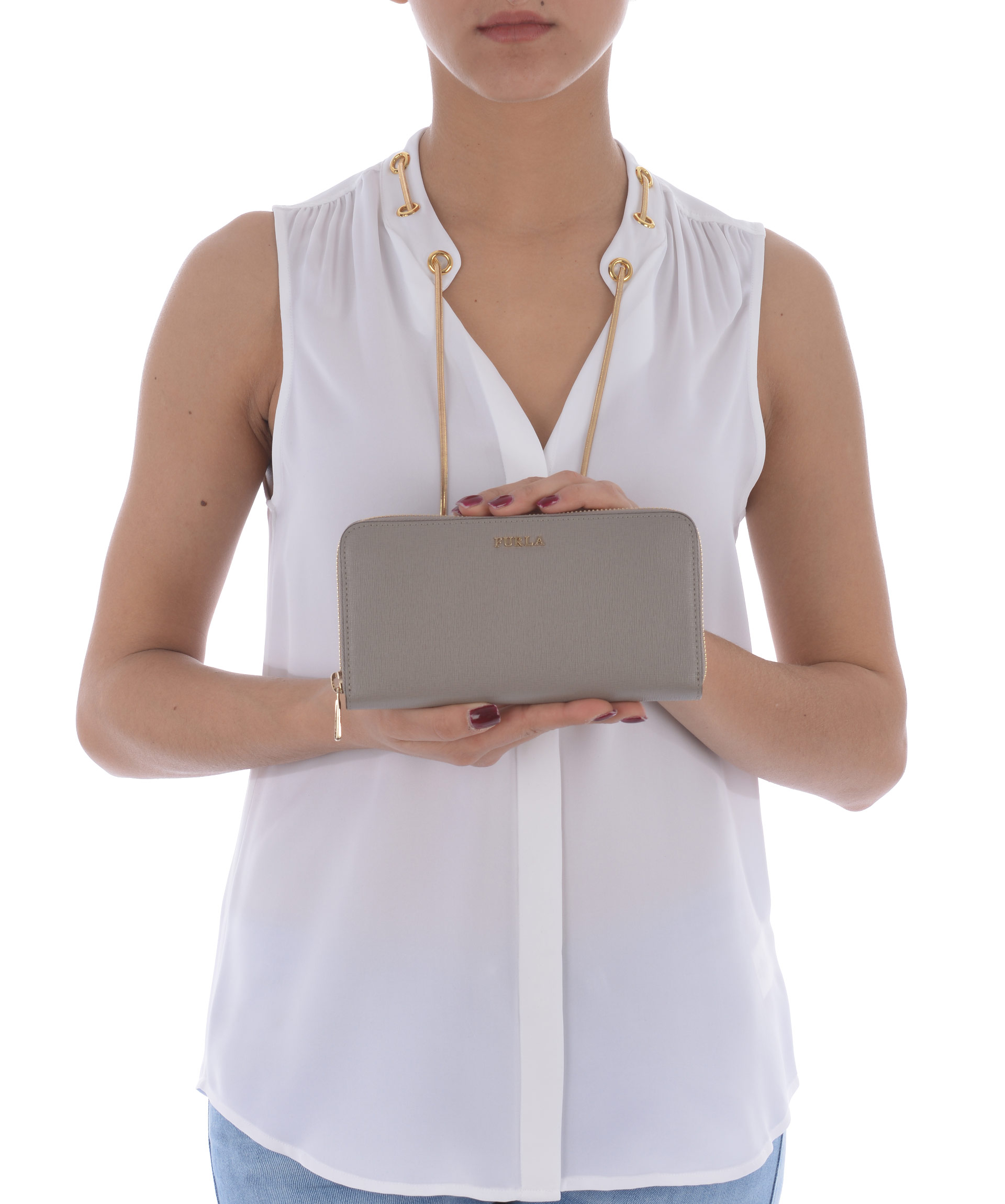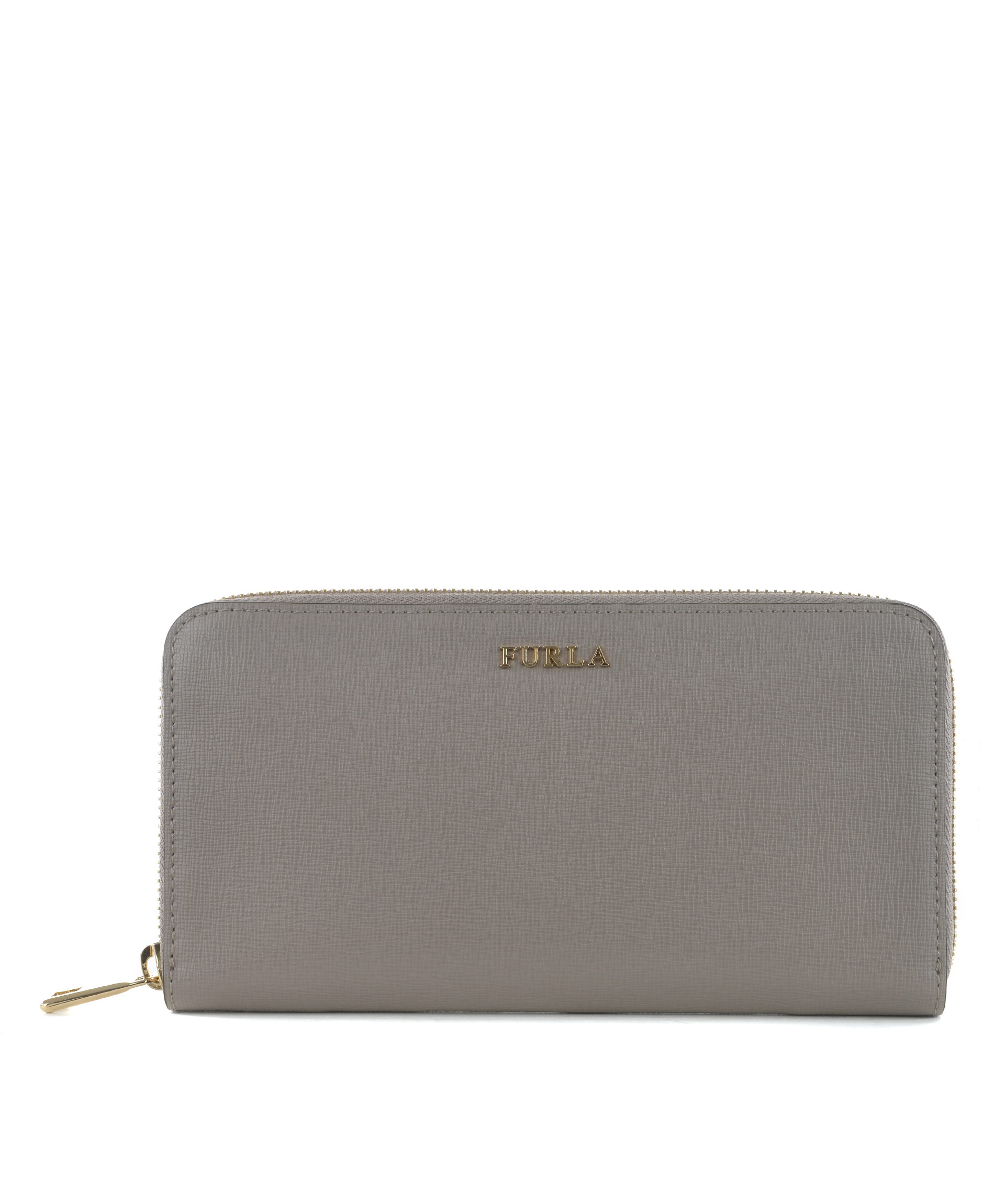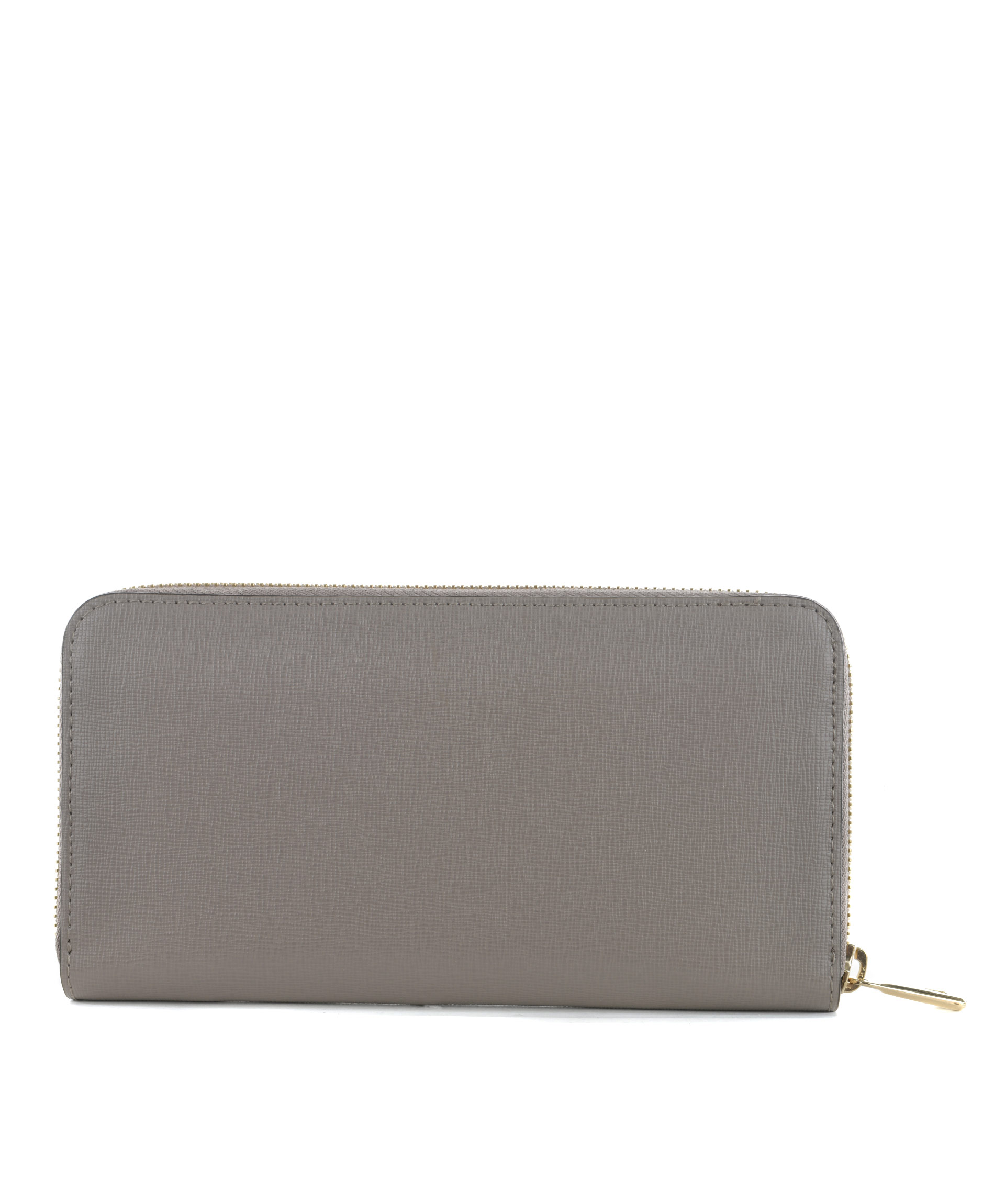 Portafogli Furla in pelle stampa saffiano Tortora. Chiusura con zip. All'interno tasca con zip, scomparti per banconote, tasche per carte di credito. Logo frontale in metallo dorato.