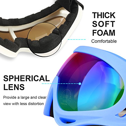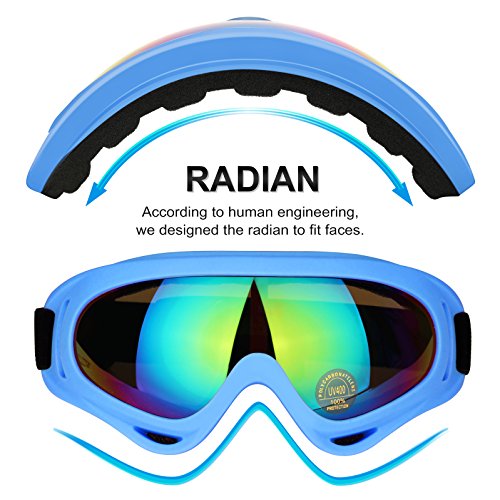 SAFE & COMFORTABLE: With the safe, elastic ABS frame and the durable, impact resistance PC lens, which protect you from bright sunshine, strong wind and thick snow fall, the goggles protect your eyes from nearly all dimensions. Also, the thick and soft layer of sponge on the frame is padding around your eye sockets for prolonged wear without fatigue, discomfort and irritation