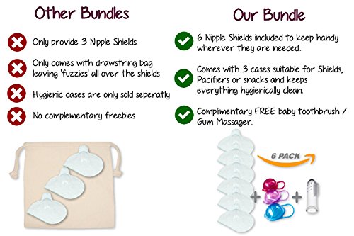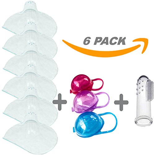 QUALITY SHOULDN'T COST THE EARTH! Our set of 6 Premium nipple shields come with 3 brightly colored cases also suitable for keeping all major pacifiers clean. Cases conveniently latch to anything from pushchair to purse and are dishwasher friendly. A complimentary FREE SILICONE BABY FINGER best TOOTHBRUSH is included to soothe and clean those tiny gums. This bundle makes the perfect baby shower gift too!