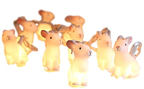 Studio : All Things Bunnies Publisher : All Things Bunnies Product Description Battery powered warm white 10 LED string of lights with 3"H x 2 1/2"W plastic bunnies. Makes a perfect night light or holiday decoration. String length: 65" Takes 3 - AA Batteries (not included) 0
