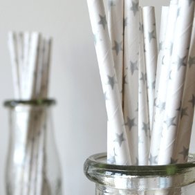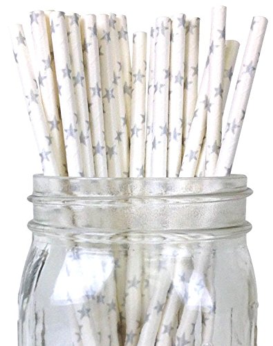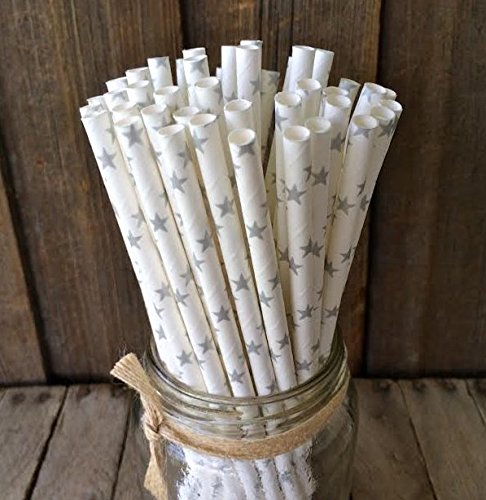 Biodegradable Paper Straws with Silver Stars - Holidays, Weddings, Showers - 100 pcs