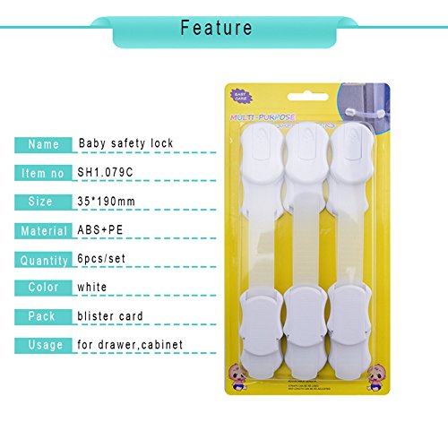 - •Baby and Child Safety Locks are very easy to use. There are 6 locks with 3M adhesive tape and 12pieces extra 3M adhesive tape as bonus. The beautiful and strong double blister card packaging good as a gift. Flexible strap works on both flat surfaces and around corners. It is easy to remove and won't leave marks on your cabinets or other surfaces.
