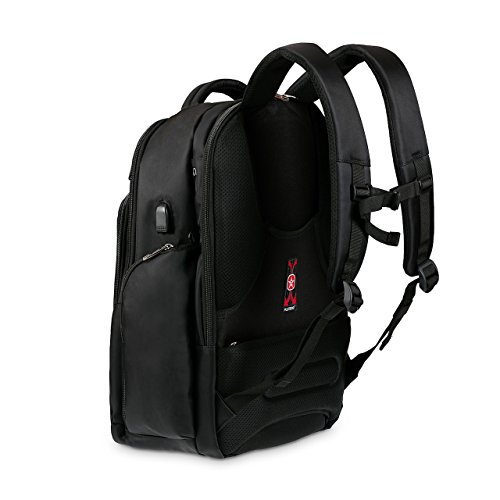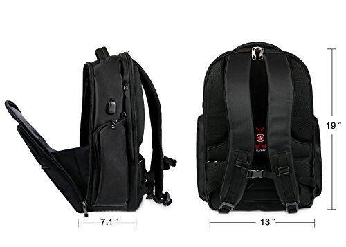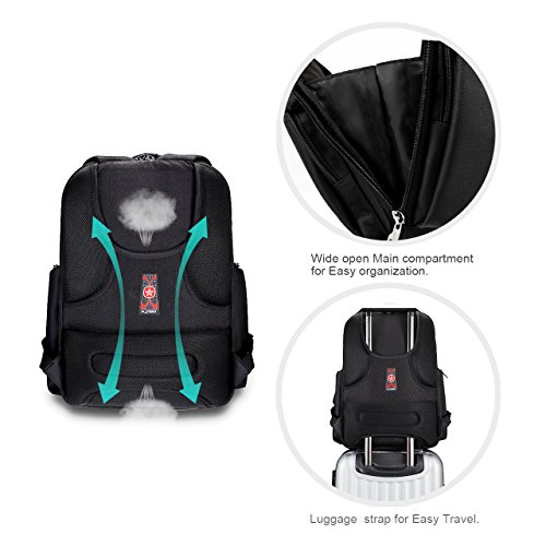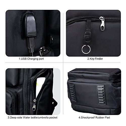 -. Feature : FOR LAPTOP - A built-in padded compartment designed to fit laptop up to 17", the back padded compartment makes the gravity point (mostly the heaviest part - the laptop) right against your back, then coordinate with ergonomically contoured shoulder straps to provide great comfort and maximum back support while traveling / DURABILITY - Made of high density 1500D ballistic nylon backed with thick waterproof material for long lasting red use. Patented dual zipper for main compartment for life long use. / COMFORT --- Multi-panel Airflow Design provides extra padding for comfort and maximum back support, a hidden pocket is designed at lower padding as a anti-thief pocket / LOTS OF POCKETS - main compartment designed with zippered pocket for passport or wallet and one smaller compartment to fit tablet; Front main pocket with organization panel for pens, name cards etc.; Quick access pocket with a detachable key fob; Side zippered pockets with elastic strap for water bottle, umbrellas etc. ;Headphone port included / ONE YEARS HASSLE FREE WARRANTY