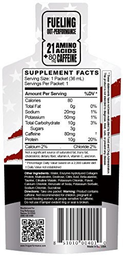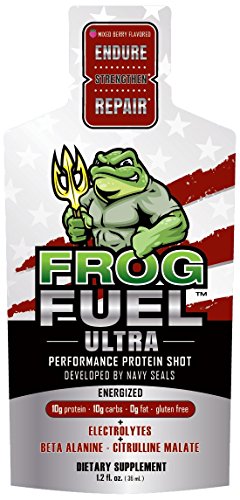 FrogFuel Ultra Energized is the FASTEST absorbed, most advanced and bio-available Liquid Protein Shot, Energy Shot / Energy Drink with Carbohydrates (Simple Carbs and Complex Carbs), Electrolytes, Beta Alanine (1500Mg) and Citrulline Malate (1500Mg). Endurance and Pre Workout supplement. 24 1.2oz Liquid Protein Shots. Not a Protein Gel.
