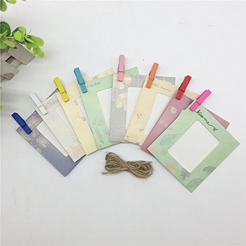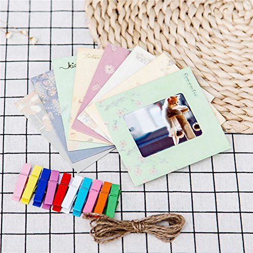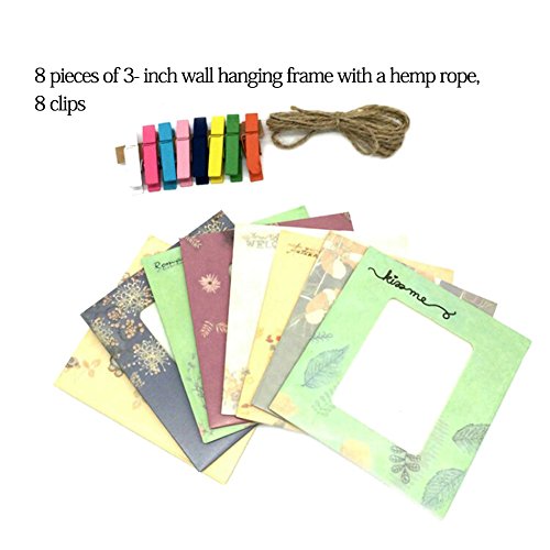 - Set comes with: 8 multi-color frames, 8 mini wooden clips and 1 hemp rope. Color frames design may differ to what is in stock.Great gifts for Christmas Day, New Year’s Day, Valentine’s Day, etc.