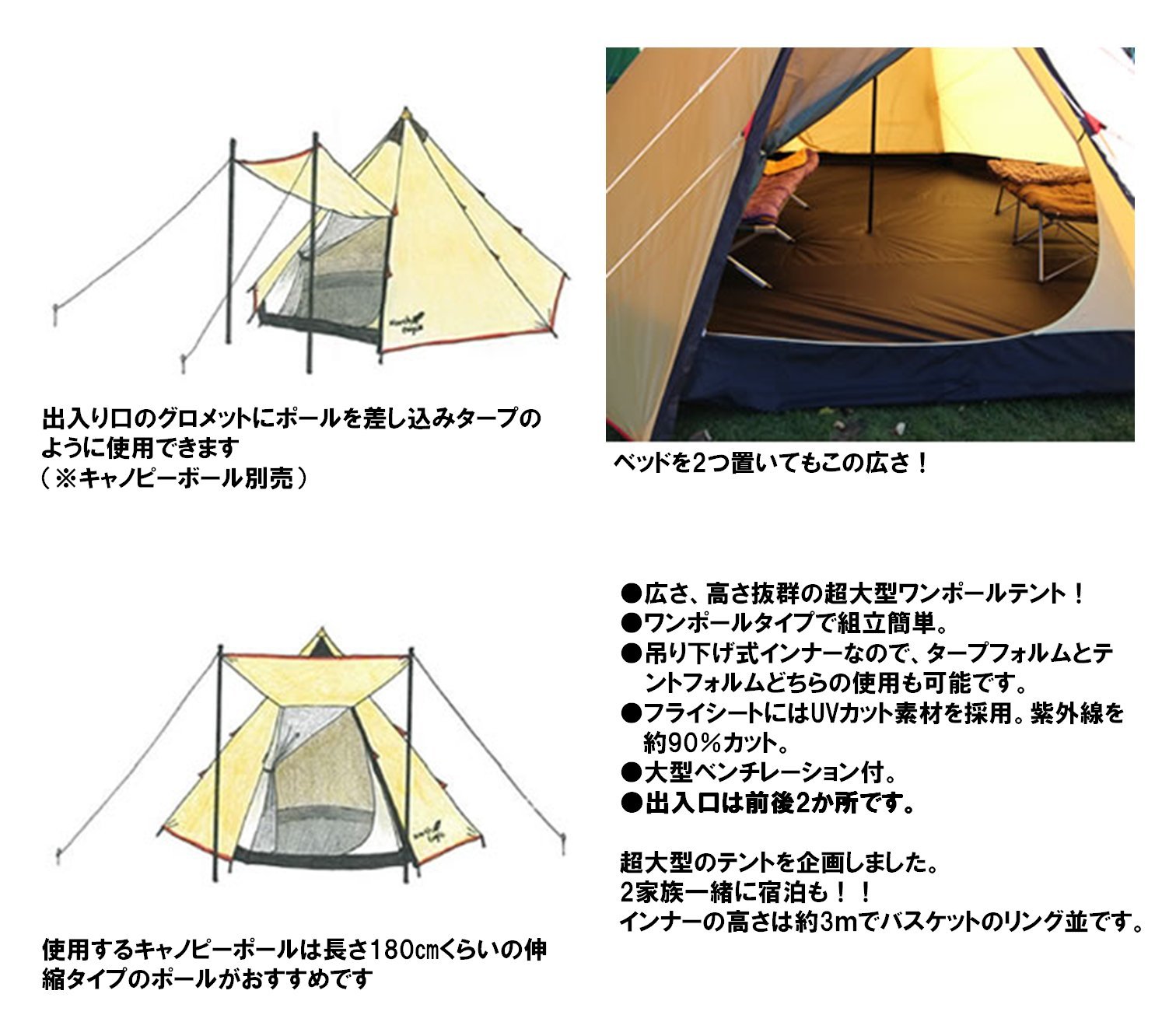 Reliable even on rainy days Spacious front with one pole tent! Can be connected with our large screen! We use UV cut material for fly sheets.