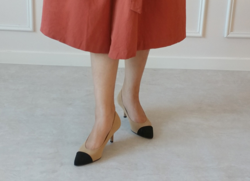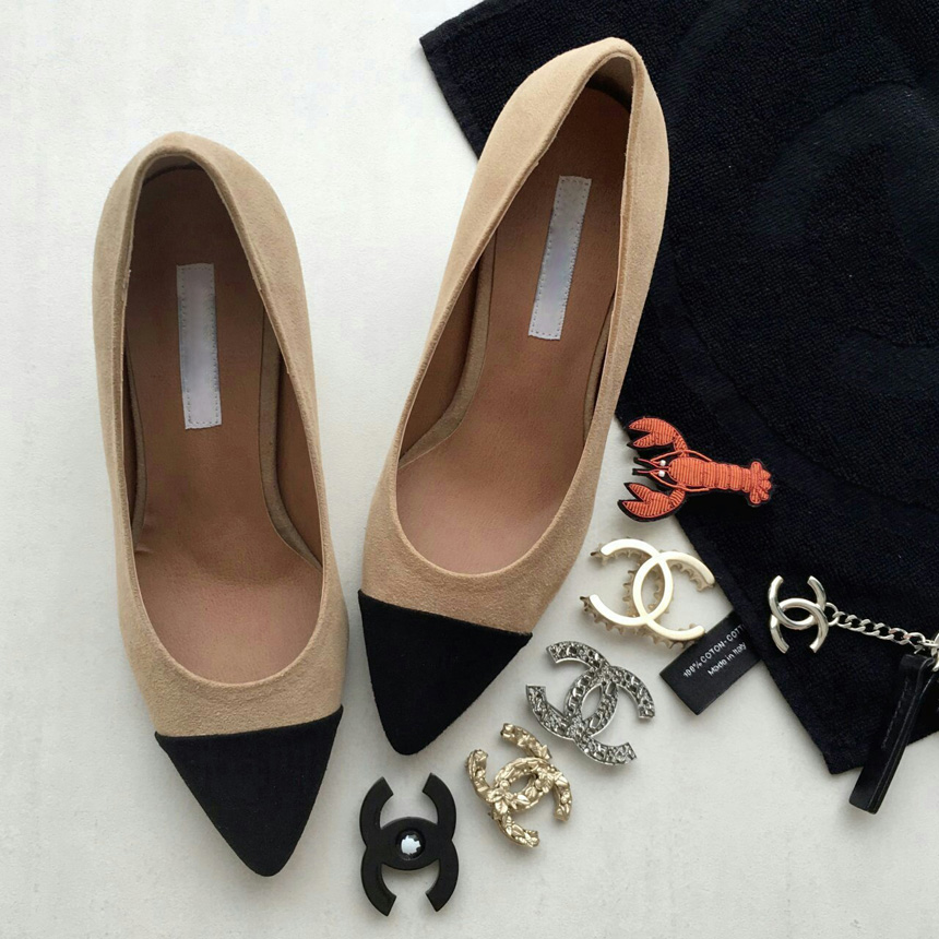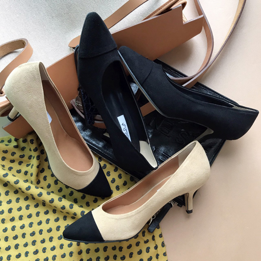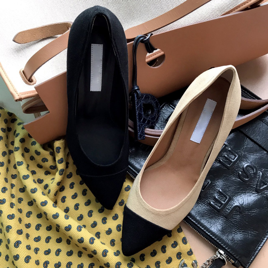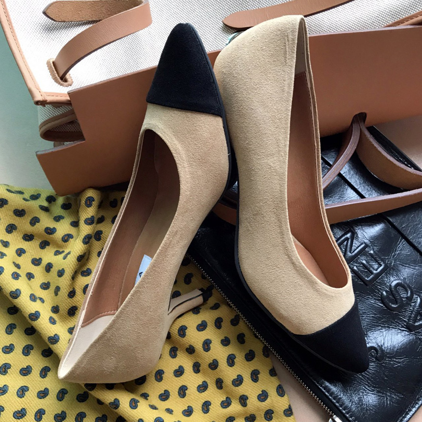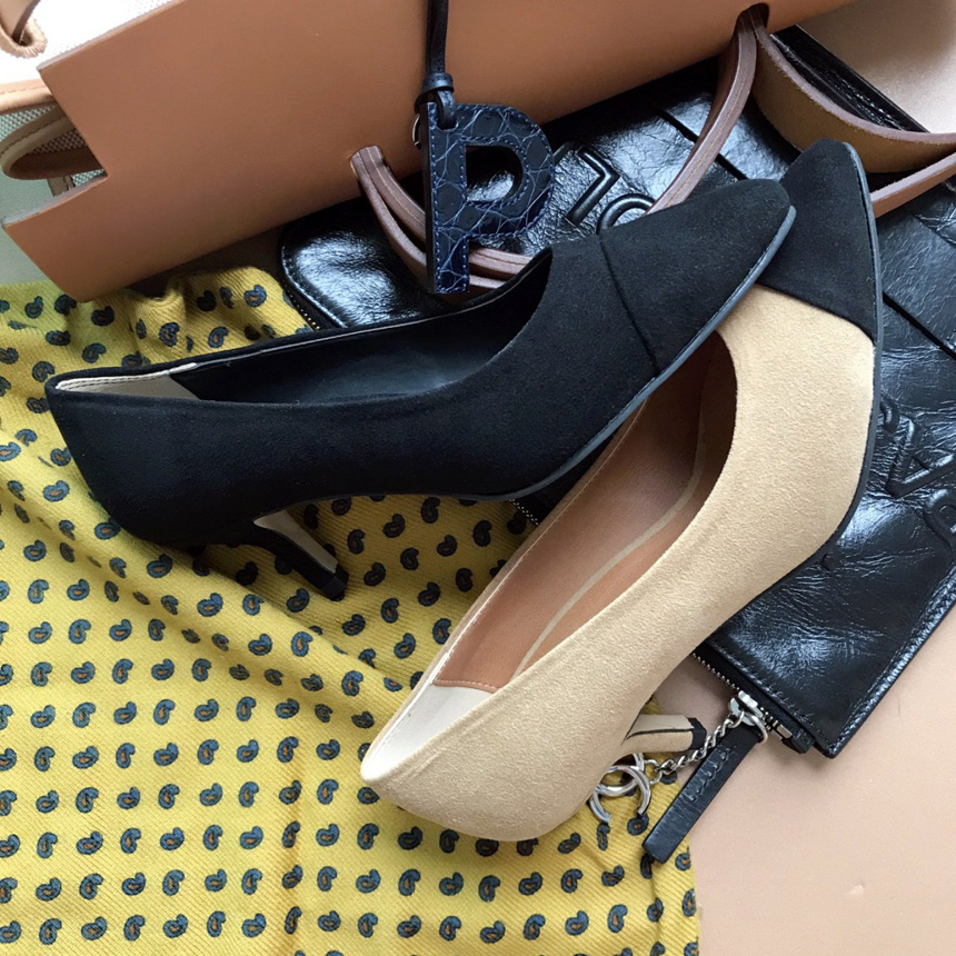 Suede two-tone mid-heel beige, black-coordinated luxury style 6cm office shoes