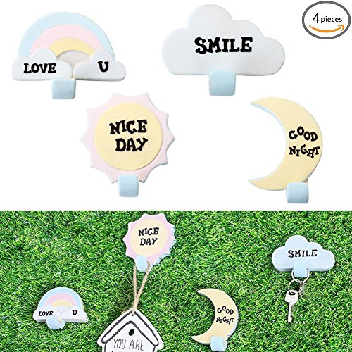 -. Feature : 4 Pcs/set lovely weather shaped wall hooks, made of eco-friendly resin. Safe and durable. / Wall mounted, more stable. Cute size, please check size measurement picture. / Sweety colors and cute shape, ideal decoration for children's room. And the design them makes it perfect for saving home space. / Can hold many items, like coat, keys, jewelry, etc. / What you will get: 4 Pcs/set hooks.(shipps with real tracking number).