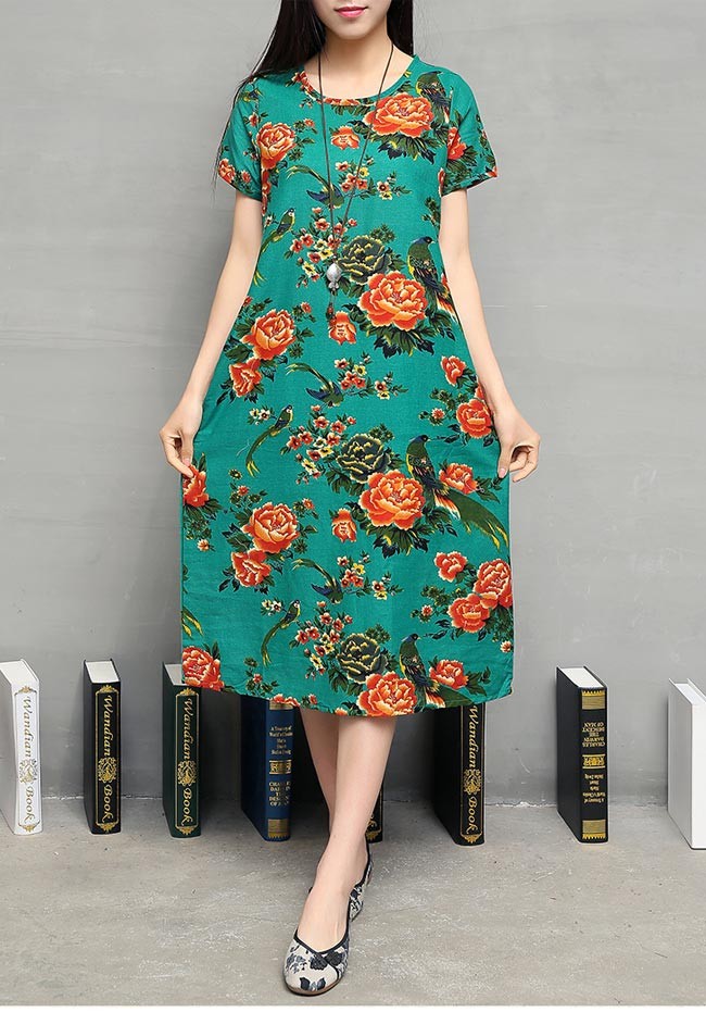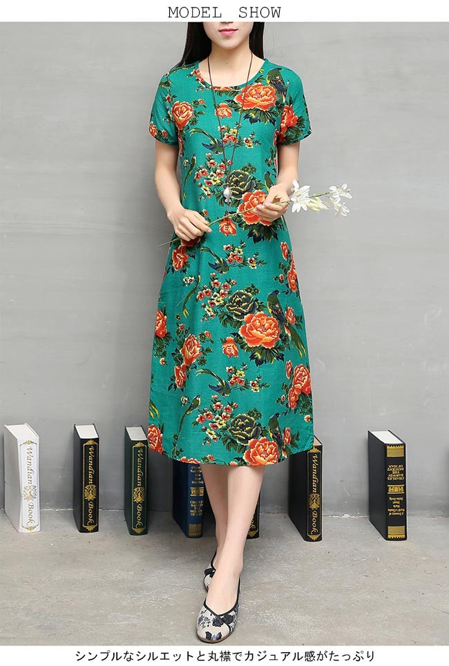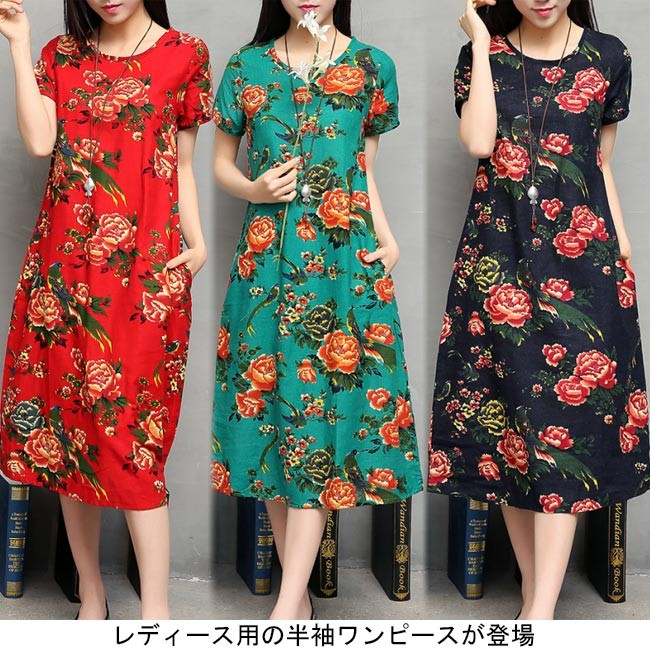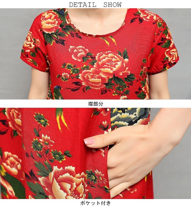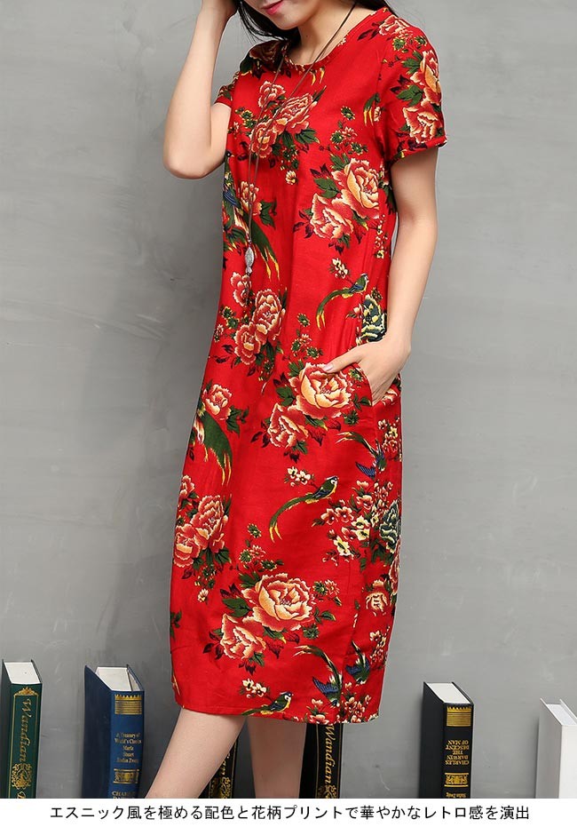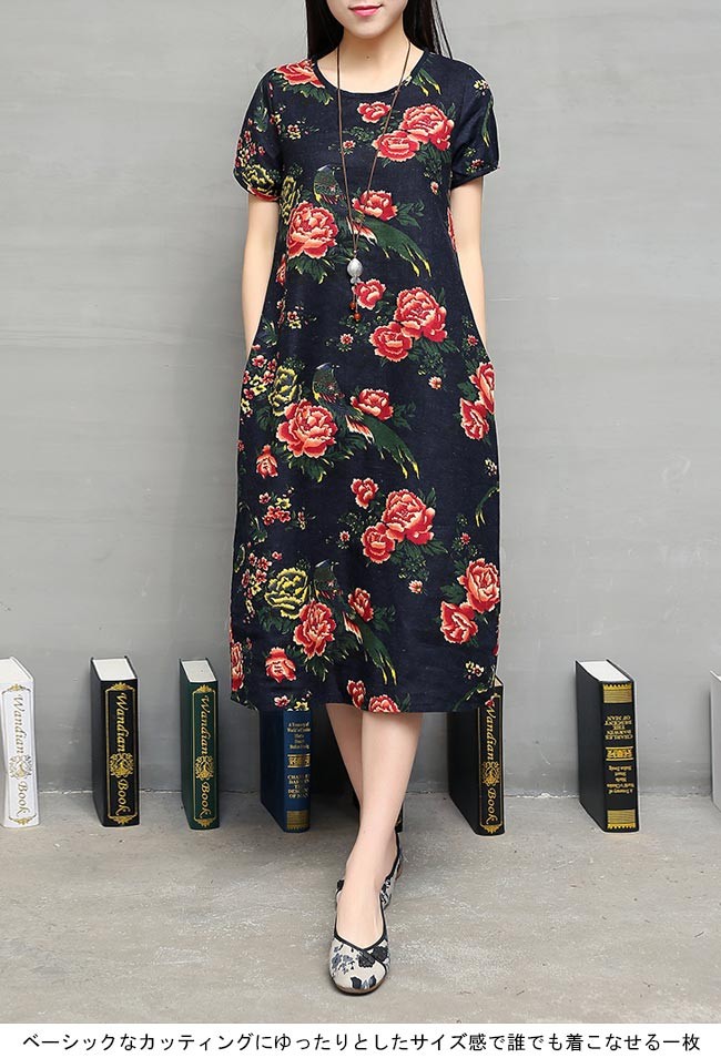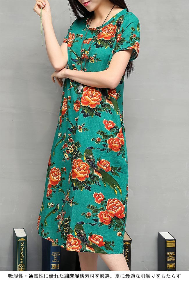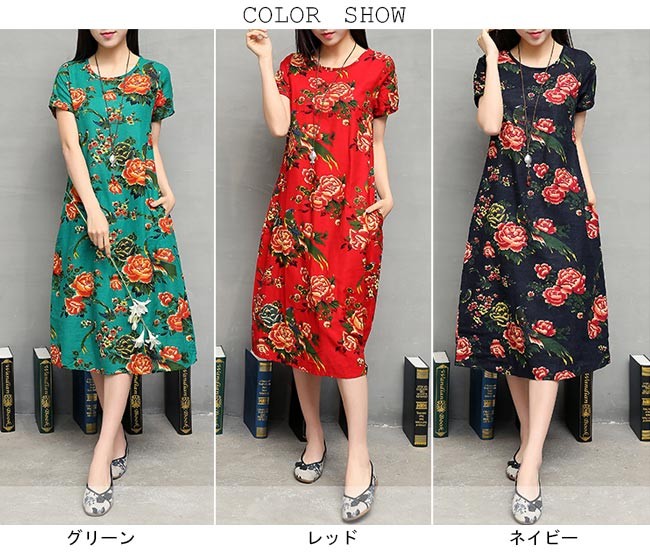 半袖ワンピース ロング丈 レディース 丸襟 花柄 レトロ ワンピース ゆったり エスニック柄 女性用 ロングワンピ 夏物 薄手 カジュアルレディース用の半袖ワンピースが登場シンプルなシルエットと丸襟でカジュアル感がたっぷり吸湿性・通気性に優れた綿麻混紡素材を厳選、夏に最適な肌触りをもたらすエスニック風を極める配色と花柄プリントで華やかなレトロ感を演出ベーシックなカッティングにゆったりとしたサイズ感で誰でも着こなせる一枚カラー:グリーン レッド ネイビー素材 綿麻混紡サイズ(cm) M L XL 2XLM バスト96 総丈105 肩幅37br>L バスト100 総丈106 肩幅38XL バスト104 総丈107 肩幅392XL バスト108 総丈108 肩幅40ご注意:※サイズは平置きサイズです。素人採寸ですので、若干の誤差がございます、ご了承ください。