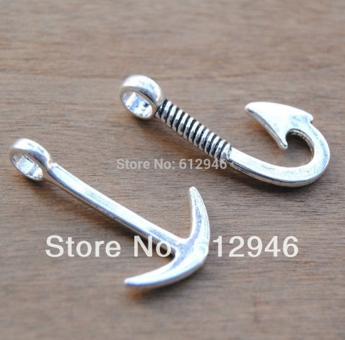 24pcs (12pcs hook and 12pcs anchor) Antique Silver Anchor and Fish Hook Charm Pendant Assortment Set Jewelry Findings (NS618)