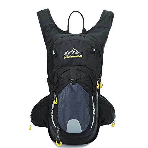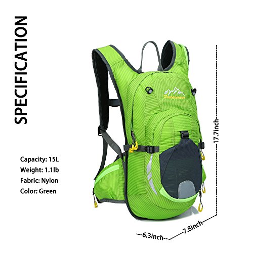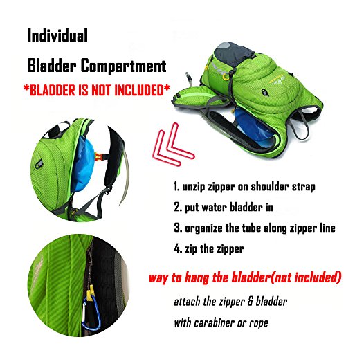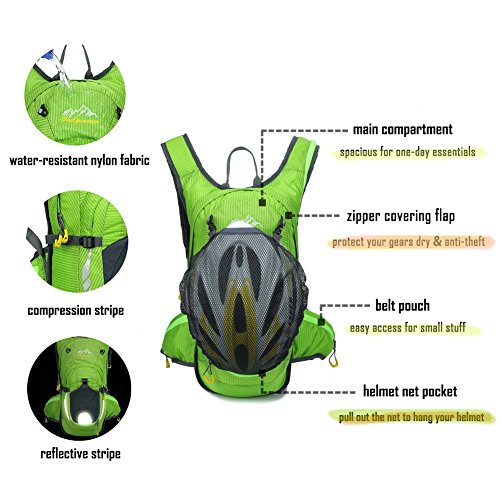 -. Feature : 【Lightweight Bike Pack, 2 Liter Bladder Compatible (bladder is NOT included)】light weight nylon fabric with individual zipper compartment for 2l hydration water bladder (Not included) to get hydrated on the go / 【Plenty of Storage Pockets to Get Essentials Organized】like GoPro, light jacket, flashlight, mirrorless camera, bike repair tool kit, first aid kit, and etc during the biking/hiking/mountain climbing/trekking/backpacking trip/commuting / 【Adjustable Straps to Keep Pack in place, No Shake】adjustable shoulder, chest strap and waist belt, secure the backpack on your back while you're cycling, running, or hiking, to ensure it doesn't slip off or jiggle around too much / 【Feature】Reflective Stripes for cycling at night; Helmet Net inside the bottom pouch to fix cycling helmet; built in Whistle on chest buckle for emergency situation; Nylon fabric, water-repellent, tear-resistant, keeps your gears dry inside the cycling backpack / 【Comfortable and Breathable】Structured padding with breathable fabric for max. breathability and comfort, to let your back breathe on the go, keep your back cool and dry