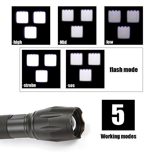 - ★Five Lighting Modes & Portable--High / Medium/ Low / Strobe/ SOS Signal, probably can save you from danger or emergency! High-Efficiency and great output LED Chip, High quality of 100,000 hours working life.