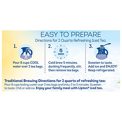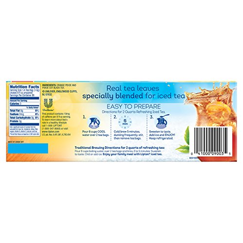 -. Binding : Grocery -. Brand : Lipton -. EAN : 0041000090035 -. Feature : Case of twelve 22-teabag boxes (264 total teabags) / Pitcher (family) size tea bags, brews with cold water in 5 minutes / 100% natural tea (Contains Orange Pekoe and Pekoe cut black tea) / Freshly brewed iced tea when you want it. / Brews in cold water so that you get freshly brewed pitcher sized tea in minutes / Pack of twelve 22-count family size tea bag boxes (total 264 tea bags) / 100% natural, no preservatives or coloring / LIPTON® orange pekoe and pekoe cut black tea is the perfect blend for a perfect cup of tea / Enjoy a refreshing pitcher of tea in less than five minutes, without hot water -. IsAdultProduct : 0 -. Label : Lipton -. Manufacturer : Lipton -. Model : 4100009003 -. MPN : 09003 -. NumberOfItems : 12 -. PackageQuantity : 12 -. PartNumber : 09003 -. ProductGroup : Grocery -. ProductTypeName : GROCERY -. Publisher : Lipton -. ReleaseDate : 2006-07-27 -. Size : Package size of 4.8 oz -. Studio : Lipton -. Title : Lipton Iced Tea, Cold Brew Cup Family Size 22 Count (Pack of 12) -. UPC : 041000090035