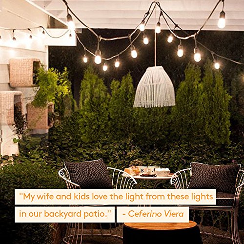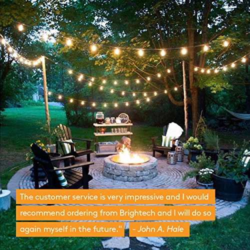 The Toughest Outdoor LED Lights AroundBrightech Ambience Pro LED Outdoor Lights feature WeatherTite technology, which means we've built the wire with extra protection against nature. Wrapped in a strong rubber casing of premium quality construction, our strands will hold up to the harshest elements. They are well insulated so you can leave them out all year long, even during bitter cold winters. Rains will fall and winds will blow, yet these heavy-duty outdoor LED light sockets are strong enough to withstand the wear and tear of outdoor use every year.Conserve energy with these 2-watt LED bulbs (15 in all) made of durable glass to lend a classy restaurant look and feel. (For replacement bulbs search for B01IQIUYU8) The vintage design with charmingly retro exposed filaments provides light bright enough to enjoy al fresco dining after dark, but at 3,000k they're still very gentle on the eyes and environment. Tether up to 40 strands together with nothing else needed to connect additional sets as they plug into one another, end to end. Lights may be attached to a dimmer for greater versatility in mood lighting. We recommend using the Lutron Dimmer, search for B004DZONXI. Easy Install: Plug and PlayMake sure the whole neighborhood knows wherever you are, is the place to be! The 48 foot length of our cord lets you arrange strands in a variety of patterns or clusters easily thanks to the hanging loops along the light strands. Attach the loops simply by using zip ties, cup hooks, or guide wire before enjoying a night under the stars. Recommended for use in arbors, your porch, or other open air spaces for festive occasions, garden parties, weddings, winter holiday & Christmas events, indoor use, city rooftops, or simply for energy saving ambience year-round. Reminiscent of carnival or romantic bistro lighting, LED Outdoor String Lights by Brightech make every night feel like a timeless celebration!