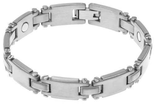 Product Description Brushed Titanium with polished accents make this an attractive and lightweight bracelet. There is a 1200 gauss magnet in each large link. 0