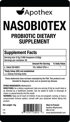 -. Binding : Health and Beauty -. Brand : Nasobiotex -. EAN : 0617377239133 -. Feature : Single organism probiotic powder / Contain L. Sakei SD-6853 Strain / 100% Sourced and Made In The USA / Made in a GMP facility -. IsAdultProduct : 0 -. Label : Apothex -. LegalDisclaimer : Use as directed. This product is not intended to diagnose, treat, cure or prevent any disease. -. Manufacturer : Apothex -. MPN : LS15 -. PackageQuantity : 1 -. PartNumber : LS15 -. ProductGroup : Health and Beauty -. ProductTypeName : HEALTH_PERSONAL_CARE -. Publisher : Apothex -. Studio : Apothex -. Title : Pure L. Sakei Probiotic Powder 10 Billion+ CFU/gm -. UPC : 617377239133