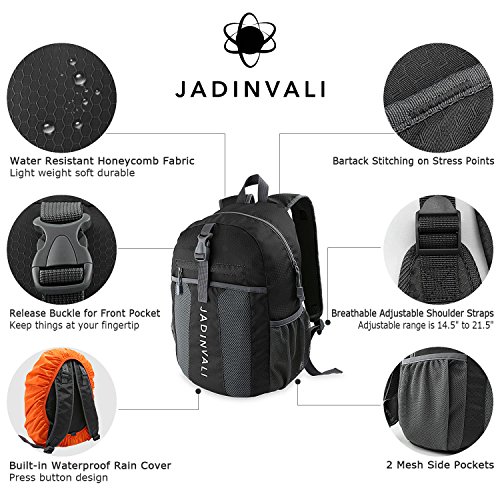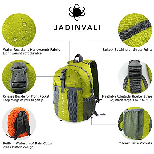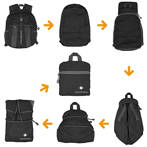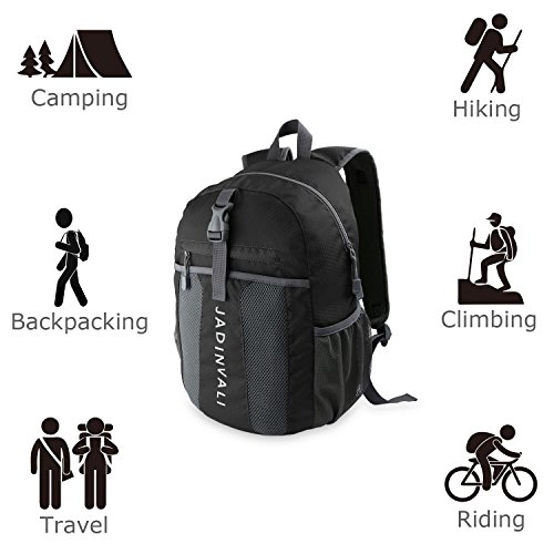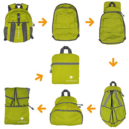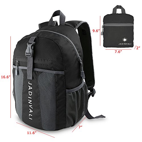 -. Feature : COMPACT AND LIGHTWEIGHT-- 0.88 Pounds and 25 Liter. This foldable backpack is a true space saver. Folds into zippered inner pocket and it converts into a handy pouch. Unfolds from pocket to backpack in seconds, keep it in your tote as an extra bag for any impromptu shopping and hiking. Dimensions: Unfold: 16.55" x 11.55" x 7" ; Fold: 7.55" x 9.5" x 2". Adjustable shoulder strap range is 14.5" to 21.5". / EXCEPTIONALLY USEFUL PACKING SPACE--Features a classic shape with several pockets for storage and organization. This packable hiking backpack has a roomy main compartment; 2 side mesh pockets for umbrellas or water bottles; 1 front external zipper pocket to hold small accessorie; 1 external mesh ventilate pocket; 1 inner zippered security pocket for valuable items; 1 zipper pocket on bottom for the choreographed waterproof Rain Cover. / EVERYDAY USE GO ANYWHERE DAYPACK--- This go-anywhere packable daypack offers a sleek stylish look and exceptionally useful packing space, it is a fantastic necessity for not matter outdoor sports or leisure activities, perfect for short trip, travel, fishing, camping, day hikes, school, camping, hunting and shopping. / BULID-IN WATERPROOF RAIN COVER---keep your backpack and belongings dry from rain, mud and dust. Dustproof, Waterproof, Scratchproof. It is perfectly functioning as an enormous strong shield for you & your backpack. / METICULOUS DETAILS--This Collapsible Rucksack is made from ultra lightweight water resistance honeycomb Polyester fabric , reinforced inner wrapping to keep the good shape and a snag-free inside, tack stitching to make handles never broke. We guarantee our products - If you are not completely satified we will replace or refund your money.