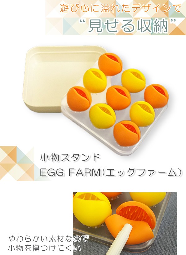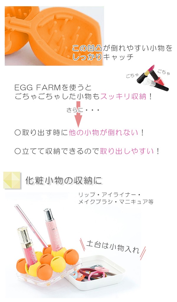 | 遊び心溢れるデザインの小物スタンドです。卵のような土台が小物をしっかりキャッチ!倒れやすい小物を立てて収納できます。ひとつひとつの小物をしっかりキャッチしているので、取り出す時に他の小物が倒れにくく、取り出しやすい!土台は小物入れとして使えます。化粧小物や常備薬、文具など様々な小物を収納できます。なくなりがちな小物も定位置が決まるので失くしにくくなります。 |