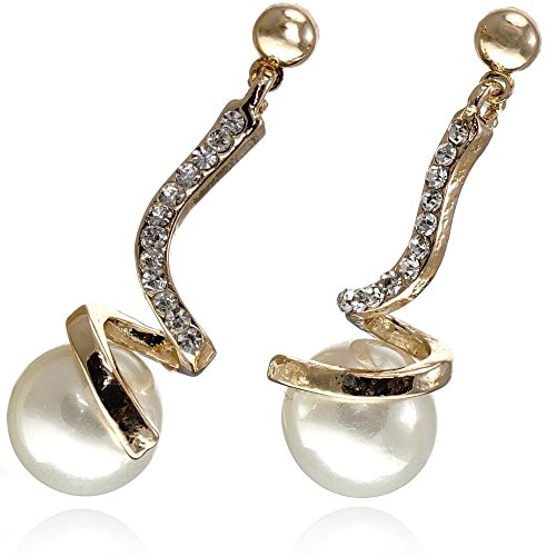 -. Feature : 渦巻き状のクリスタルで大粒パールを吊り下げる可愛らしいぶら下がりピアスです。 / 材質:合金 ラインストーン フェイクパール / ゴールドコーティング / 留め具はスタッドタイプです。 / パール直径:11㎜