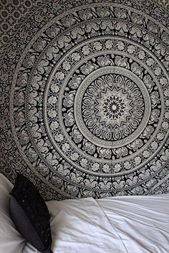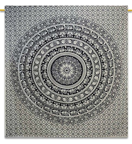 Labhanshi 90 x 90 inch Elephant Mandala Indian Traditional Hippie Cotton Tapestry, Black and White, Queen