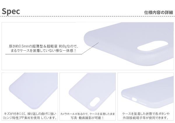 | キズが付きにくく、繰り返しの曲げに強い(ヒンジ特性)PP素材を使用。軽度の衝撃、擦りキズから端末をしっかり保護します。厚さ約0.5mmの超薄型&超軽量なので、まるでケースを装着していない様な一体感に!!ケースを装着したまま写真・動画撮影、各ボタンや外部接続端子等が使用できます。 |