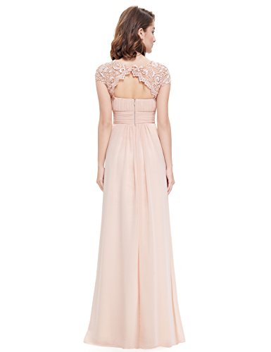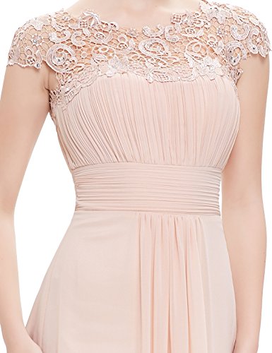 Elegant floor length chiffon evening dress with lacey cap sleeves. Perfect for your next formal occasion whether it be an evening party or even your turn as the mother of the bride or groom. Delicate lace and rhinestones decorate the neckline while the ruching in the bust and waist creates a figure flattering silhouette.Feature