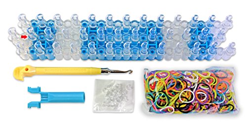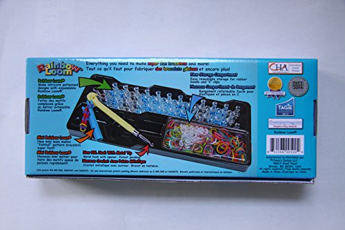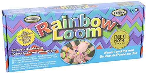 Studio : Choon's Design LLC Publisher : Choon's Design LLC Binding : Toy Product Description Package includes:* One Rainbow Loom* One Mini Rainbow Loom* One hook with metal tip* A bag of 600 mixed opaque color latex-free rubber bands (colors may vary)* A bag of c-clips* Anti-Counterfeit Secret Code is affixed to the instruction manual* Instruction manual for making simple bracelets.This kit is enough to make up to 24 rubber band bracelets.Rainbow Loom products are recommended for 8 years children to adult. Adult supervision is recommended for younger children. WARNING: Not for children 3 years and younger due to potential choking hazards. Package contains a functional sharp object (hook). 0