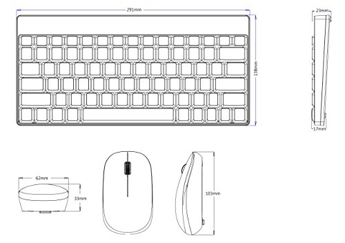 System requirement Windows XP, Vista, 7, 8, 10 USB port specification-keyboard Dimension: 291x138 x 20 mm weight: 295G battery: one AA battery (not included in the package) key switch Type: membrane on/off switch: no specification-mouse Dimension: 103x62x33 mm weight: 58G battery: one AA battery (not included in the package) sensor: Optical DPI: 1000 DPI battery: one AA battery on/off switch: no number of button: 3 scroll wheel with middle click: Yes wireless operating distance: 10 M (33 Feet) wireless technology: 2.4GHz, with Nano receiver.Feature
