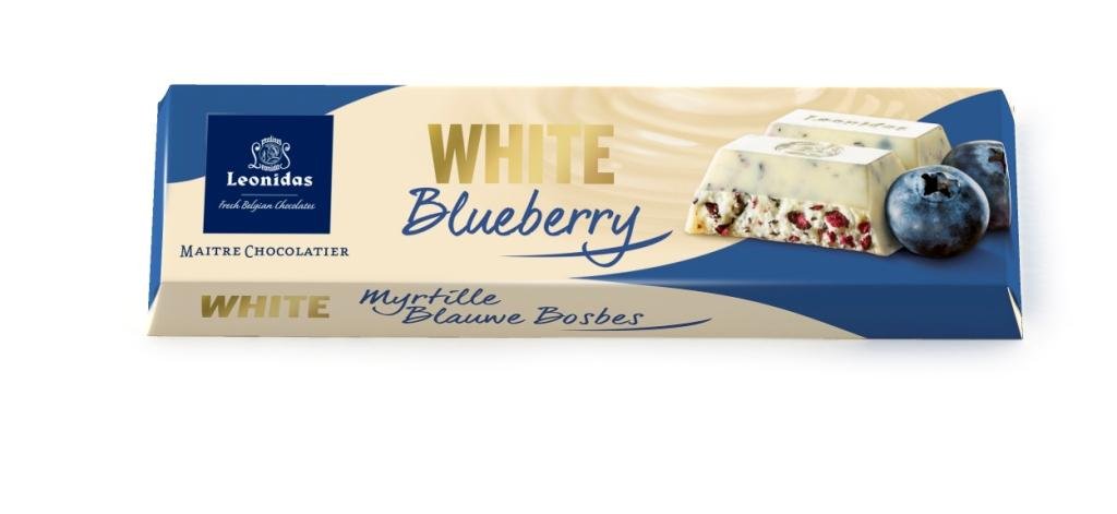 Smooth white chocolate with blueberry chips.