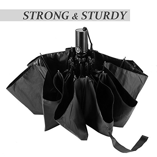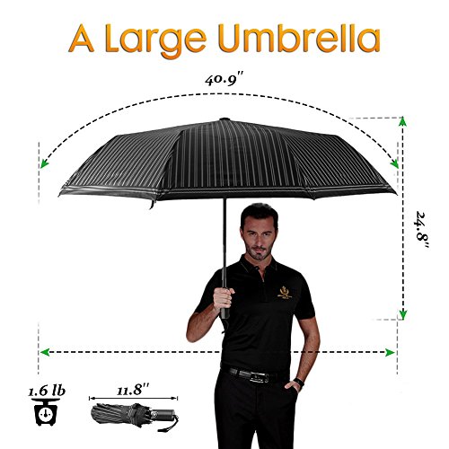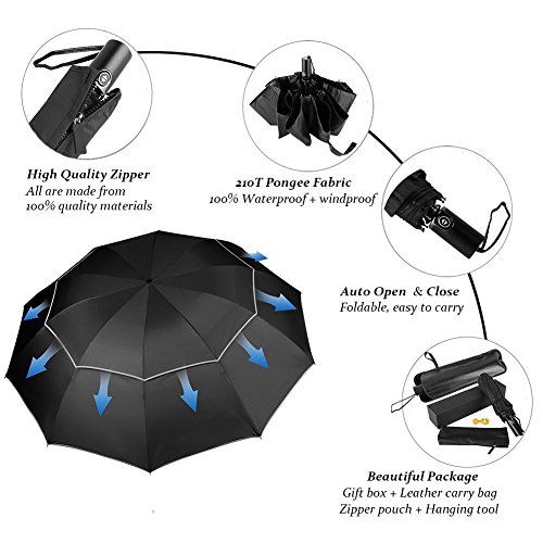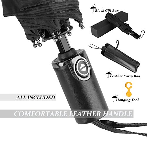 -. Feature : HIGH QUALITY MATERIALS - 210T Pongee Fabric (Waterproof); High-density proof fabric (Sunproof); 10 Steel Ribs (Durable & Strong Windproof); Leather handle (Comforable to hold and luxury apperance) + Zipper Pouch + Leather Carry Bag (Convenient to carry and maintain) + Hanging Tool(Convenient for you to hang up your umbrella) + Black Gift Box (Not just for beautiful look, it gives extra protection for unexpected shipping accident, making the umbrellas ship to you/your friends/family safely). / AUTOMATIC + FOLDABLE - One hand operation. Just press the button and umbrella will open or close.Three folding design. Folding length of umbrella is 11.8 inch. Suitable to put in the bag. / WINDPROOF WITH 10 RIBS - Compact 10 Steel Ribs 70 MPH Windproof offers a stronger, wider and more durable canopy with 10 ribs. / WATERPROOF + SUNPROOF - This umbrella is highly waterproof and quick drying and with high-density proof fabric, it is a highly anti-UV UPF50 sunproof umbrella. / BEST SIZE FOR OUTDOORS - Unfold as 41" diameter is big enough to provide protection for 2 people, and folded length is 11.8'', which can be put inside your handbag or backpack. No matter what weather it is, snowing, raining, windy, hot, sunny, you can just use this Savanaha umbrella in every season! You can take it when camping, walking, Picnic, for golf or any outdoor activities. Suitable for Students/office workers/women/men/boys/girls.