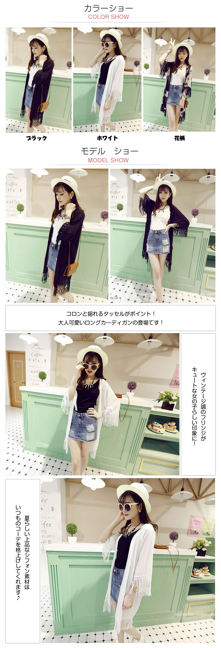 | コロンと揺れるタッセルがポイント!大人可愛いロングカーディガンの登場です!ヴィンテージ調のフリンジがキュートな女の子らしい印象に!夏らしい上品なシフォン素材はいつものコーデを格上げしてくれます?カジュアルコーデの必須アイテムは、薄手だから避暑地への旅行や機内の寒さ対策にピッタリです。折り畳むことができてコンパクトになれるので、小さなバッグにもINできて持ち運び便利。 | |