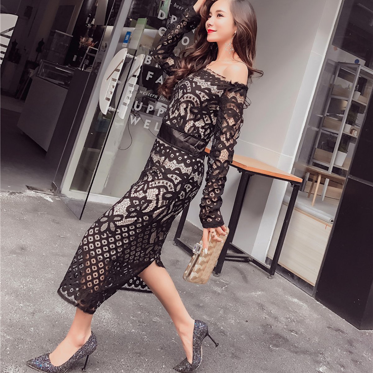 上品な花柄刺繍レースとオフショルダーがエレガントな印象のワンピースドレス。