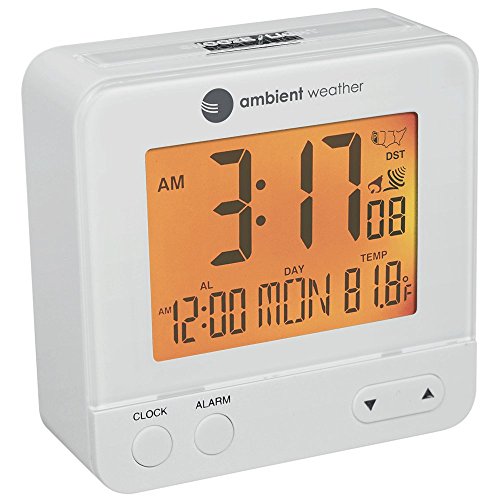 The Ambient Weather travel alarm clock with Auto night light feature is very compact (2.5 x 2.5 x 1.0") but large on features. Equipped with an atomic clock, time is set automatically via radio and in synch with the U.S. Atomic clock for utmost accuracy and automatically sets adjusts for daylight savings time. The alarm clock features an automatic back light display which activates in low light settings. The screen displays time, alarm time, time zone, month, date, day of week, indoor temperature and radio controlled clock reception strength icon. The clock also features an alarm switch, snooze button, and temperature units of measure switch. Displays time in 12 or 24-hour formats. Features four time zones (Pacific, Mountain, central, Eastern), one-touch glow display, indoor temperature display and crescendo alarm. Displays in 5 languages ( English, French, German, Spanish and Italian). perfect for camping, the clock also makes the ideal bedside companion and accurate synchronization reference for other Clocks in your home or business.